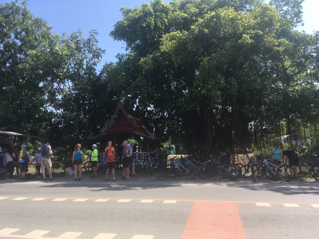 We cycled for a couple of hours and racked up approx 50km, taking in the scenery as we went. So many temples by the roadside and some amazing shrines. It was a bit bizarre and not quite what I expected, many new, modern apartment blocks and private estates, alongside shanty town (think Heath Robinson) style dwellings, which I had expected. The variation was both odd and interesting. Temperatures reached 37degrees at one point, with high humidity and we were all grateful for the rest stops the team had put on for us. We were greeted on three occasions along the way with refreshments, fresh fruit, nuts, biscuits and cold drinks. My favourite were the mini bananas, who knew they even exisited!