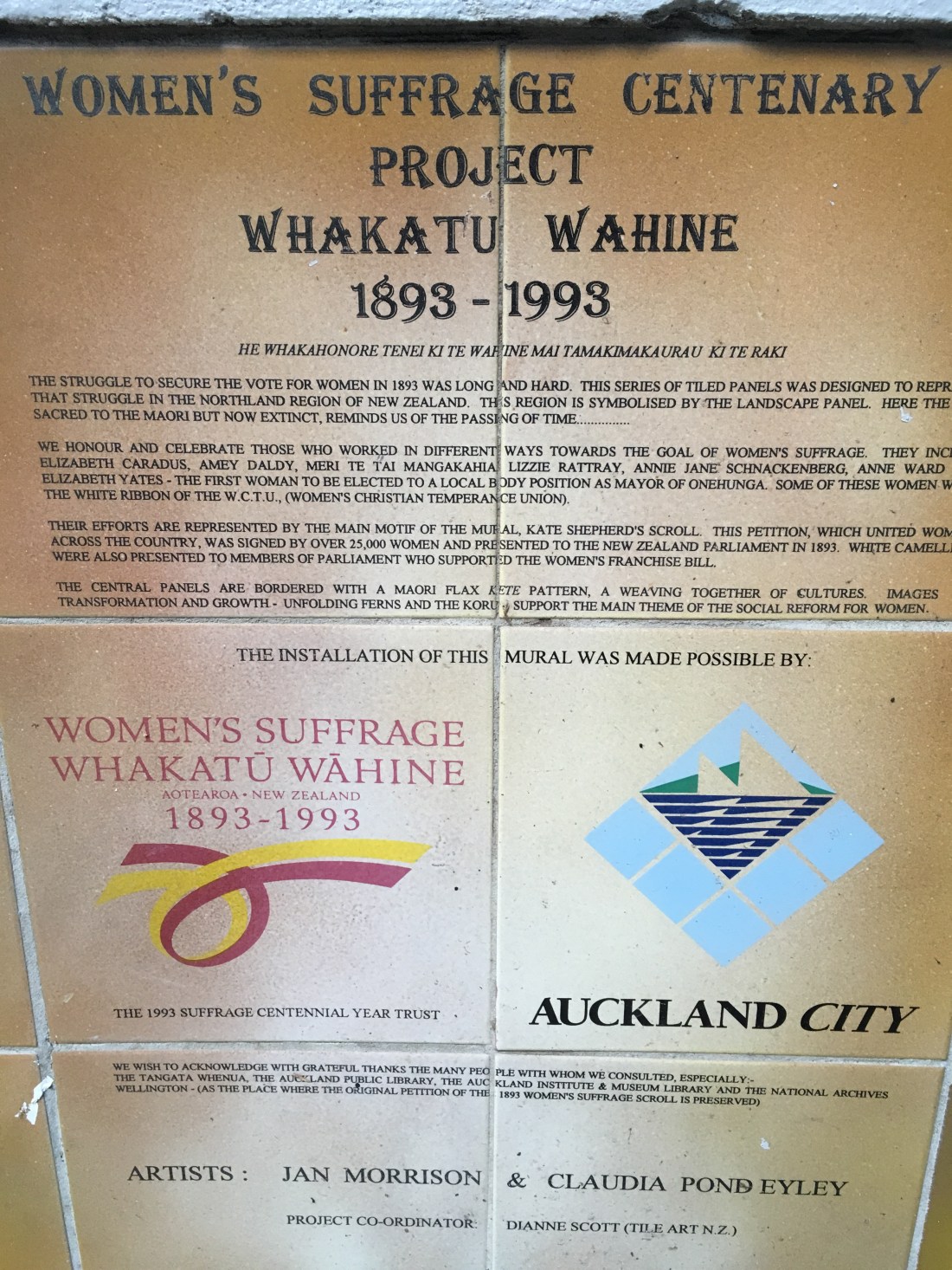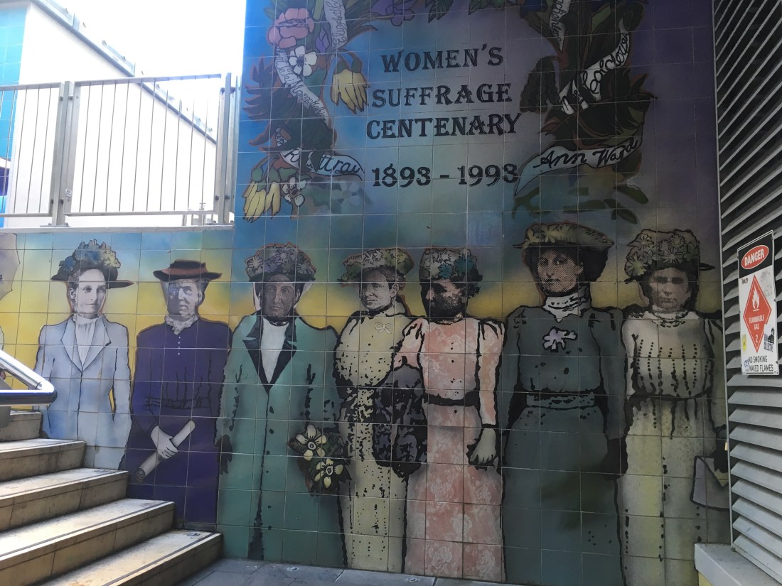 We had dinner down by the harbour a few times and did a little walking tour of the city, as described by the Lonely Planet guide book. We visited the Auckland Art Gallery and checked out some of the sights, including these amazing tiles, telling the story of New Zealands women being the first in the world to get the vote.
