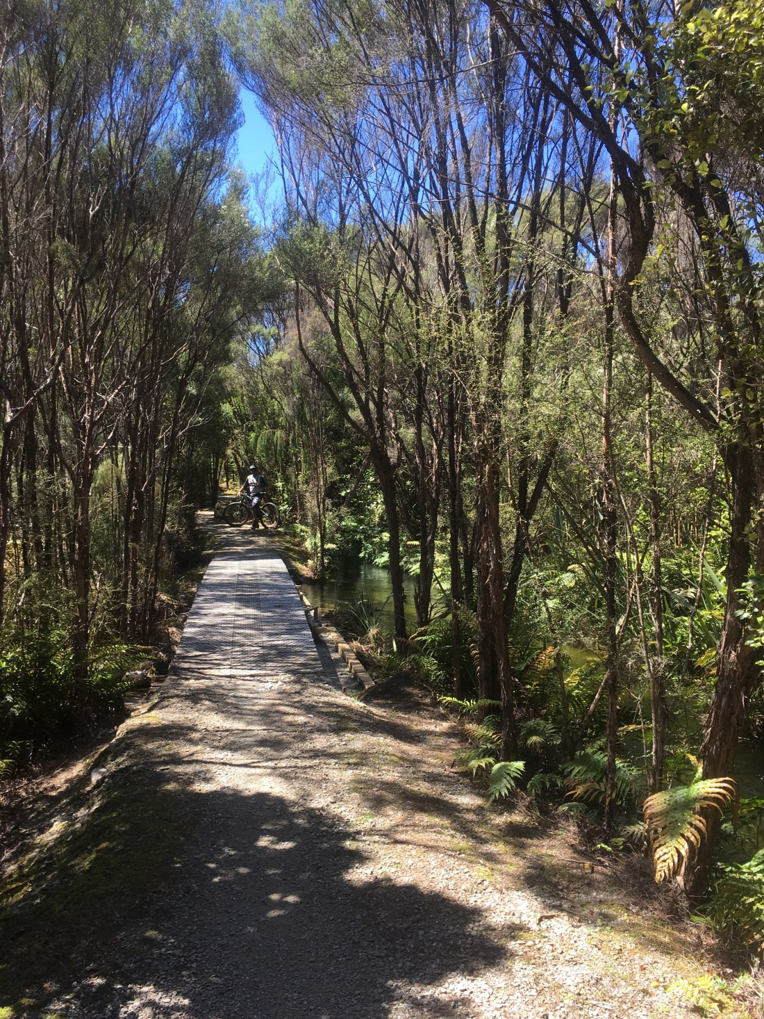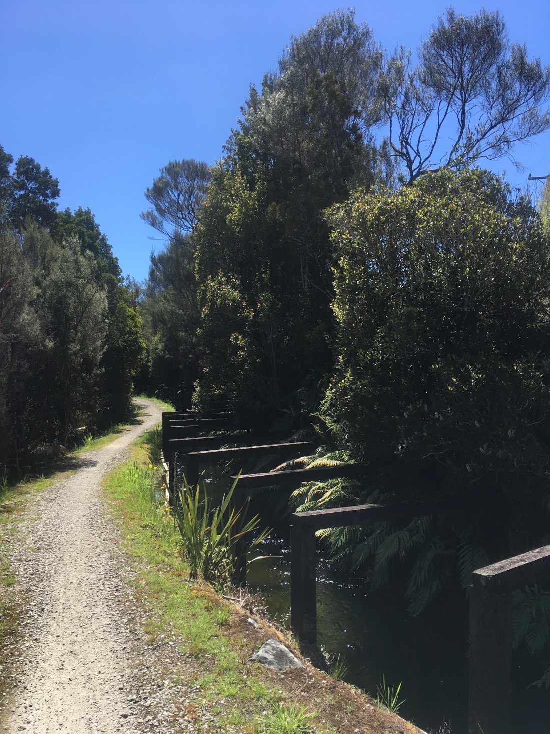 We took the bikes out for a little spin along the lake, and up on to a small section of the West Coast Wilderness Trail. It traverses alongside a historic waterway (a man made “water race” used in mining or irrigation :bloke) and was a really cool piece of trail, almost perfectly flat single-track with wooden bridges, but suitable for families.