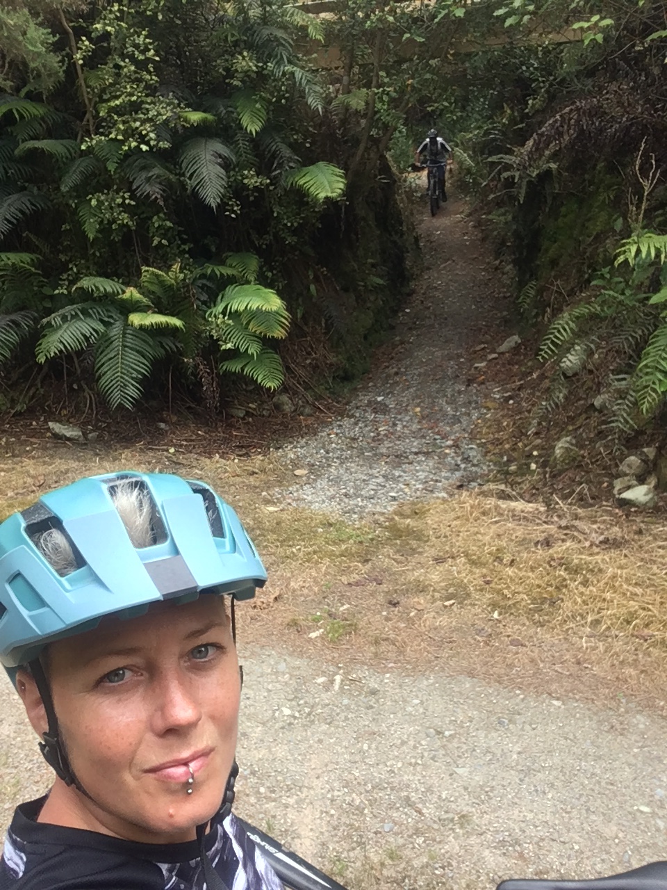 This is me waiting for the bloke to come back up the wider section of the ascent, on his way back from sneeking in an extra trail while I got my breath back π. Look at those lovely ferns, I’m loving riding through all this lush foliage.