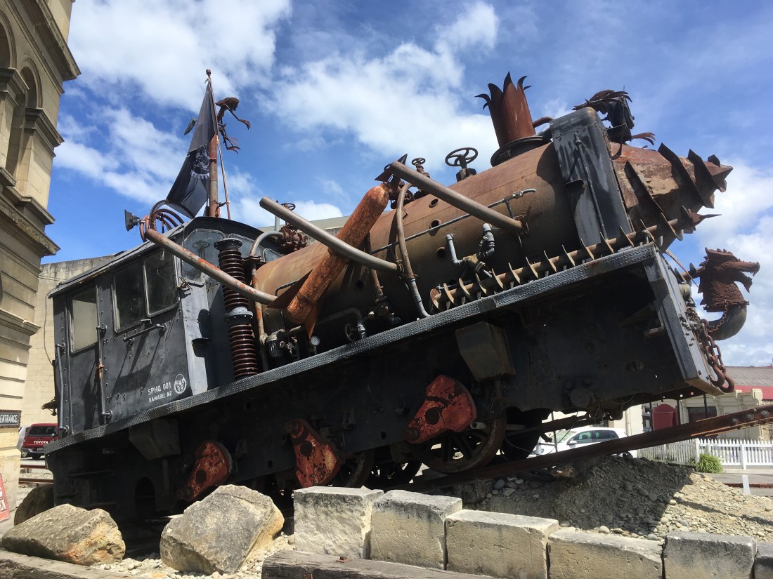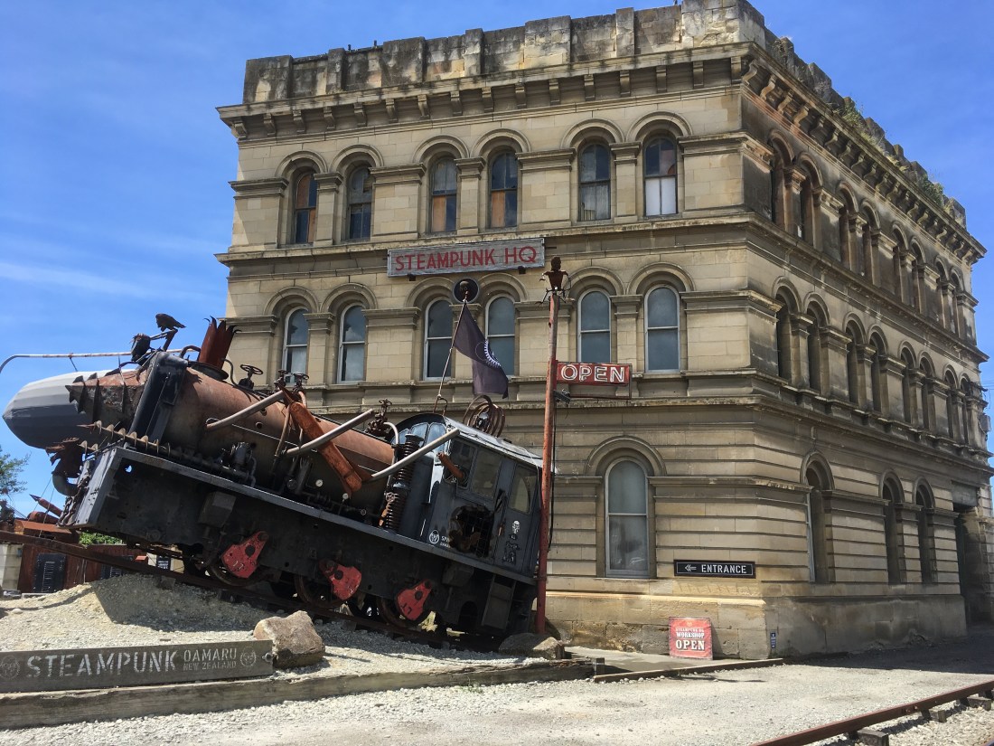 First stop, Oamaru. This place is known as the Steampunk capital of New Zealand and it didn’t disappoint…I loved it! But before I get on to that, I must tell you it is also known for its Yellow-eyed Penguin Colony (according to the signs on site: only 300 breeding pairs :bloke). These penguins are a bit larger (30cm) and much rarer than their little blue cousins, also found here in NZ. They waddle ashore every night at sunset to feed their young and stay until around 3am, before heading back out to sea again. We stayed at a campsite where the penguins came into and it’s surprisingly how noisy the little buggers are. We managed to see a few of them come ashore, they are very cute indeed. We were told not to use any flash on our cameras, so no photos I’m afraid. You’ll just have to take my word for it on this one (and mine! :Bloke).