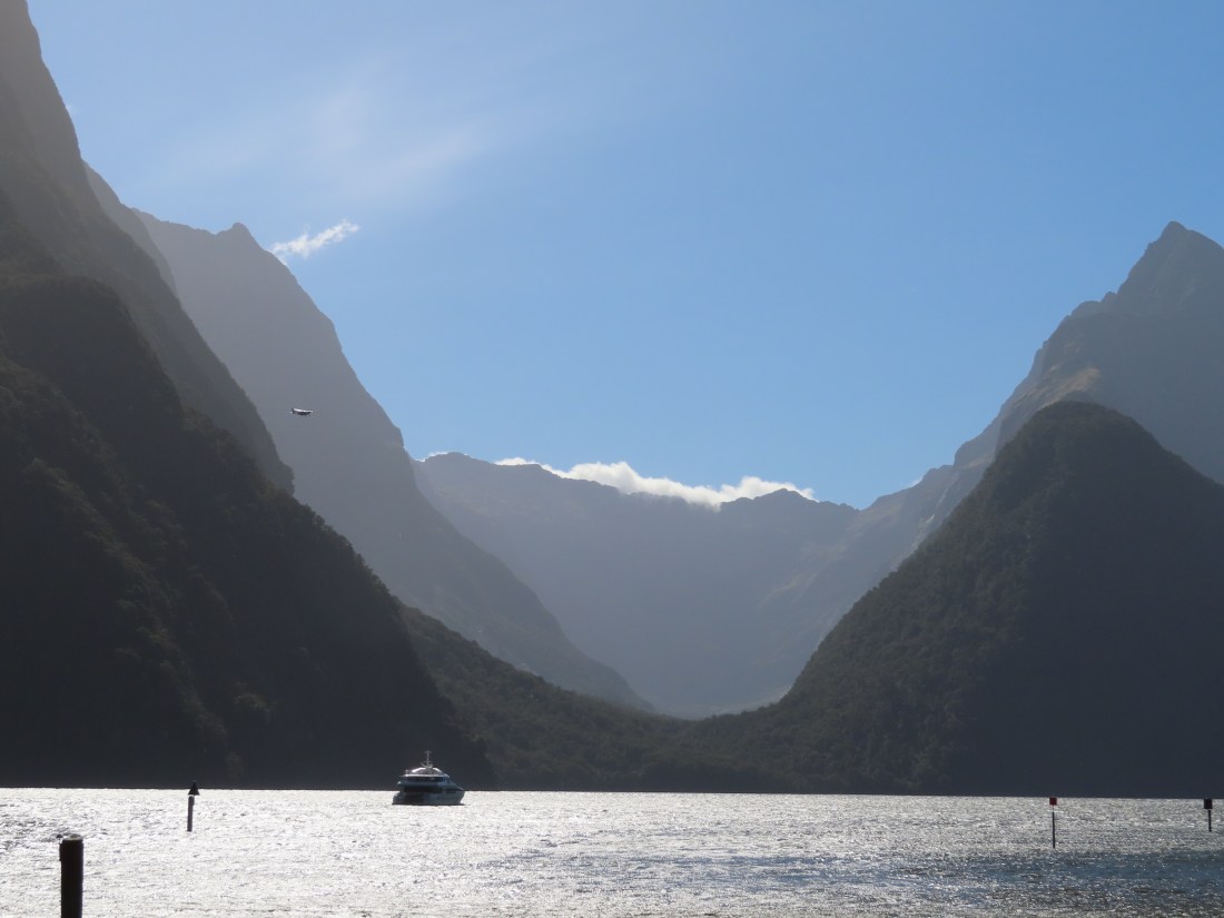 These were taken from the back of the catamaran, in the late afternoon sunshine. The second photo shows a light aircraft at approximately 1000 metres, the same height as Snowdon, with Mitre Peak in the shade on the right hand side, with one of the ferries in the foreground.