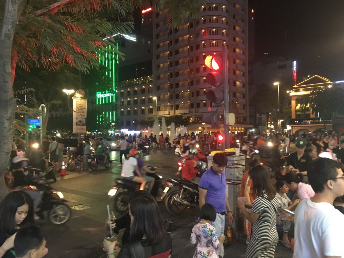 A street scene for you from a Friday evening in Ho Chi Minh city. Note the red light but the scooters still riding through it.